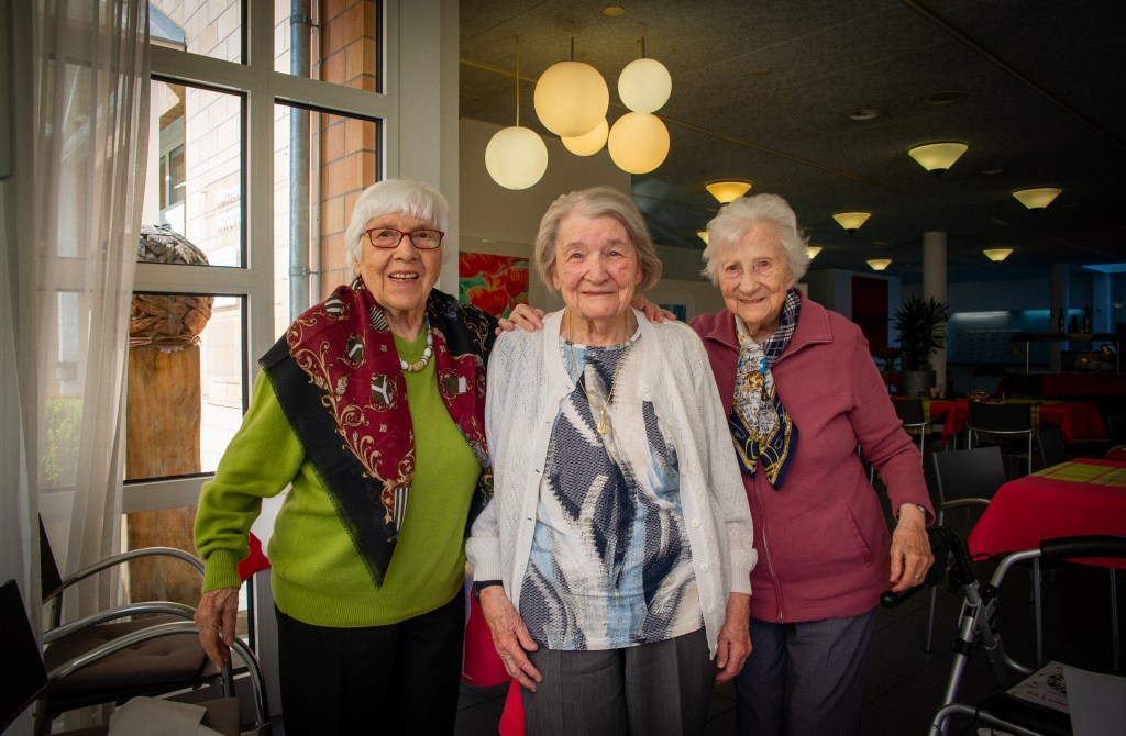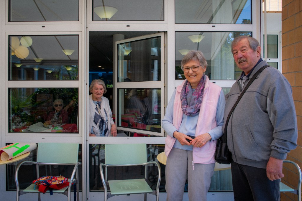 A l’intérieur, Mme Burri célébrait allègrement ses 101 ans à table avec deux amies du Home: Mme Kaufmann de 100 ans, et Mme Mainini de 91 ans. Les trois se sont levées avec souplesse pour remercier depuis la fenêtre. J’ai pu ainsi faire leur portrait depuis l’extérieur, et avec toute la prudence à laquelle nous sommes maintenant habitués.